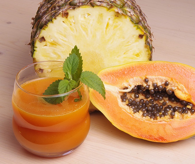 -Parte la piña y la papaya en trozos. Vierte los ingredientes, excepto el hielo y licúa.