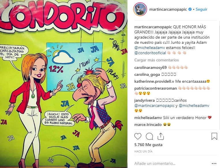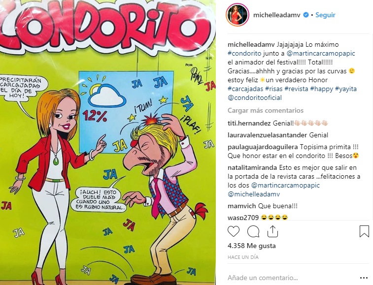 Además, Michelle también subió foto de su aparición en el cómic. “Lo máximo Condorito junto a Martín, el animador del festival ¡Total! Gracias… y gracias por las curvas, estoy feliz. Un verdadero honor”.
