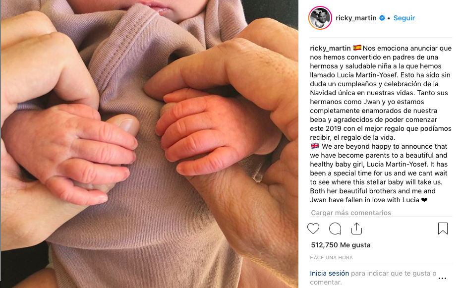 "Nos emociona anunciar que nos hemos convertido en padres de una hermosa y saludable niña a la que hemos llamado Lucía Martin-Yosef", escribió Ricky Martin en su cuenta de Instagram.