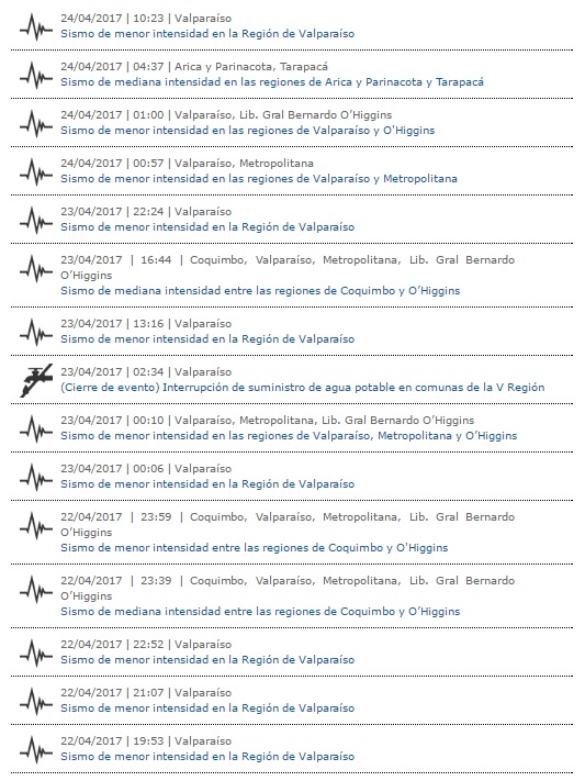 Hasta el momento se han percibido más de 30 temblores iguales o superiores a 3 grados Richter, mientras que cuatro de ellos superaron la barrera de los 4,0 grados. A continuación puedes ver cuáles son los sismos más fuertes que se han registrado desde el 22 al 24 de abril, según información de la Onemi.