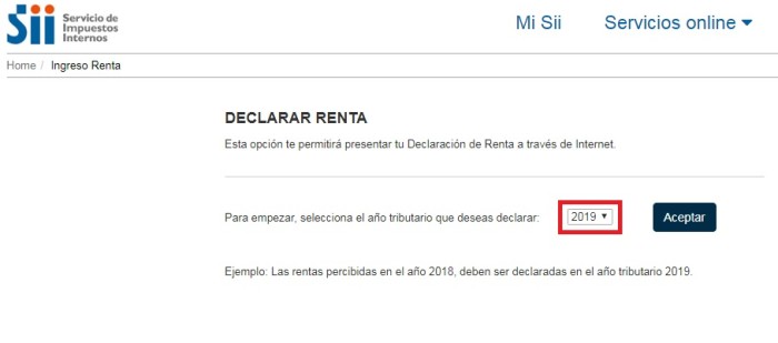 4. Posteriormente debes seleccionar el año tributario 2019 y hacer click en aceptar. (Las rentas percibidas en el año 2018, deben ser declaradas en el 2019).