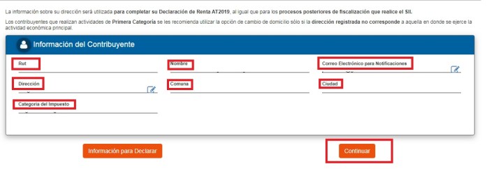5. Si la información del contribuyente es correcta y no debes modificarla, haz click en continuar.