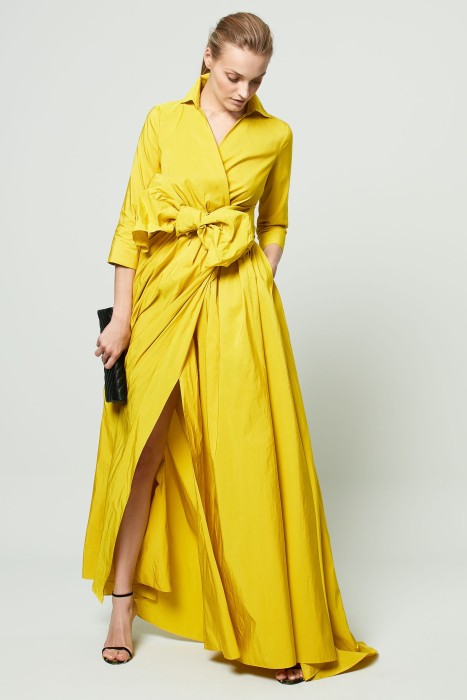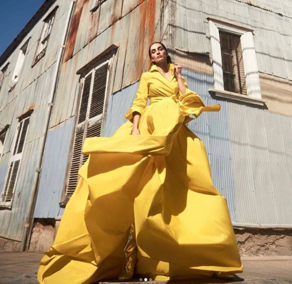 Estamos hablando de un arriesgado diseño de Carolina Herrera en color amarillo oriental, pieza que ha impuesto tendencia en la actualidad por su combinación entre algo sencillo pero formal. Este look pertenece a la colección de otoño invierno 2017 de Carolina Herrera.