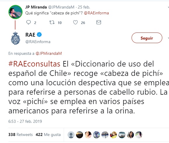 En un tui, la RAE respondió: "El Diccionario de uso del español de Chile recoge 'cabeza de pichí' como una locución despectiva que se emplea para referirse a personas de cabello rubio. La voz 'pichí' se emplea en varios países americanos para referirse a la orina".