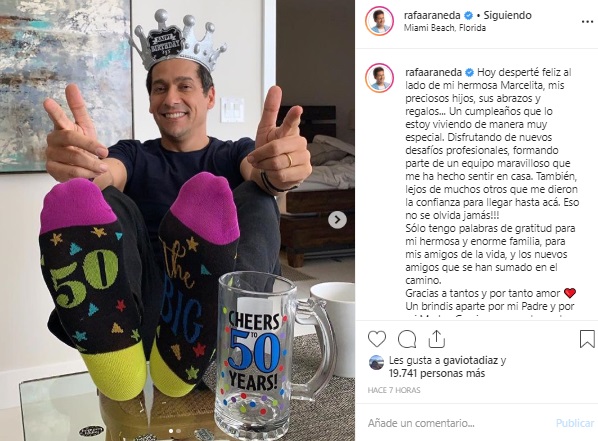 'Eso no se olvida jamás!!! Sólo tengo palabras de gratitud para mi hermosa y enorme familia, para mis amigos de la vida, y los nuevos amigos que se han sumado en el camino. Gracias a tantos y por tanto amor ❤️ Un brindis aparte por mi Padre y por mi Madre. Gracias por regalarme la bella posibilidad de ser parte de ésta hermosa historia que me ha tocado vivir!!! Abrazo a todos¡¡¡¡ Los quiero mucho!!!!', añadió Rafael, quien actualmente anima un programa en Univisión.