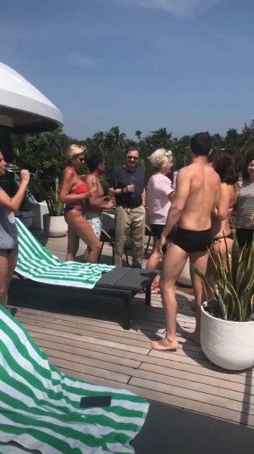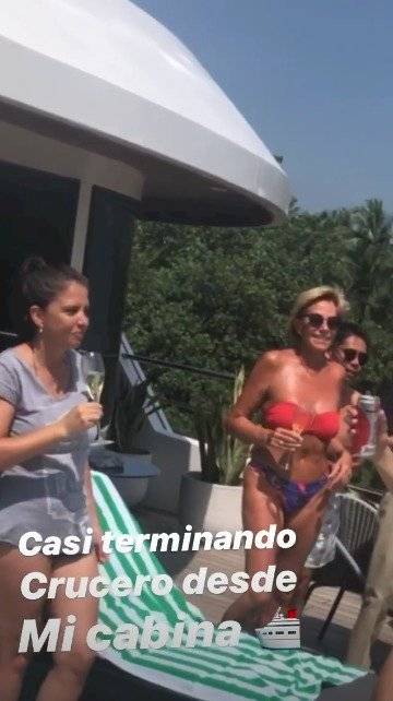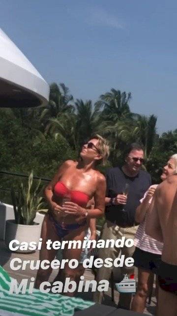 "Casi terminando crucero desde mi cabina", escribió en uno de los registros donde se le ve con un conjunto compuesto por un top strapless coral y un calzón azul conversando con otras personas.