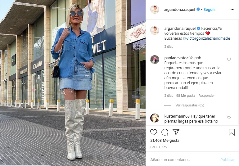Ahora Raquel volvió a recibir una crítica similar tras compartir otra foto posando en la vía pública y sin mascarilla. "Paciencia, ya volverán estos tiempos", escribió Argandoña en la publicación, ante lo cual una seguidora quiso 'pararle los carros'.