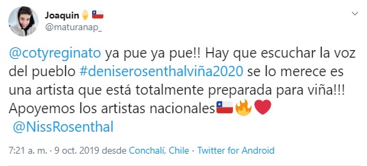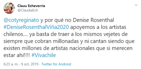 Revisa algunos de los tuits que piden a Denise Rosenthal en Viña 2020: