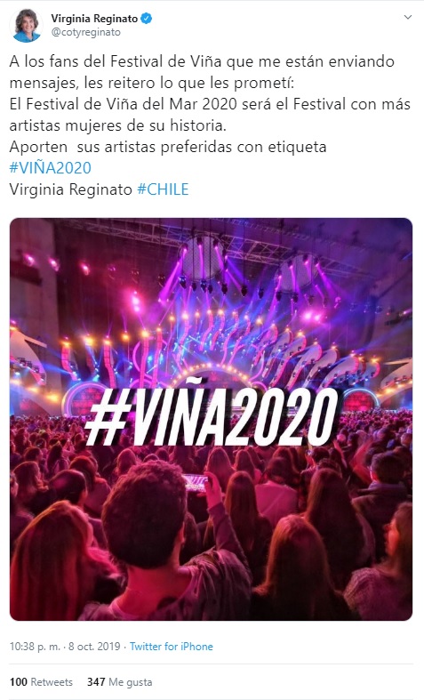 "A los fans del Festival de Viña que me están enviando mensajes, les reitero lo que les prometí: El Festival de Viña del Mar 2020 será el Festival con más artistas mujeres de su historia. Aporten sus artistas preferidas con etiqueta #VIÑA2020", escribió.