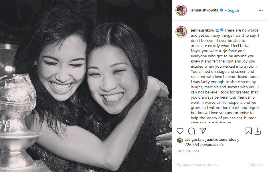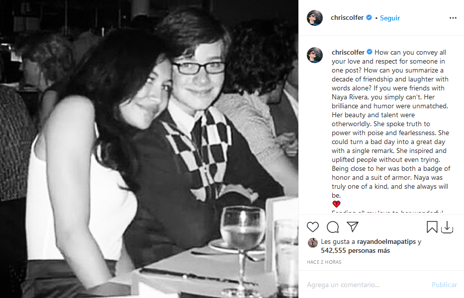 "¿Cómo puedes transmitir todo tu amor y respeto por alguien en una publicación? ¿Cómo puedes resumir una década de amistad y risas solo con palabras? Si eras amigo de Naya Rivera, simplemente no puedes. Su brillantez y humor eran inigualables. Su belleza y talento eran de otro mundo. Ella le dijo la verdad al poder con aplomo y sin miedo. Ella podría convertir un mal día en un gran día con un solo comentario. Ella inspiró y elevó a la gente sin siquiera intentarlo. Estar cerca de ella era tanto una insignia de honor como una armadura. Naya fue verdaderamente única en su clase, y siempre lo será 💔 Enviando todo mi amor a su maravillosa familia y su hermoso hijo".