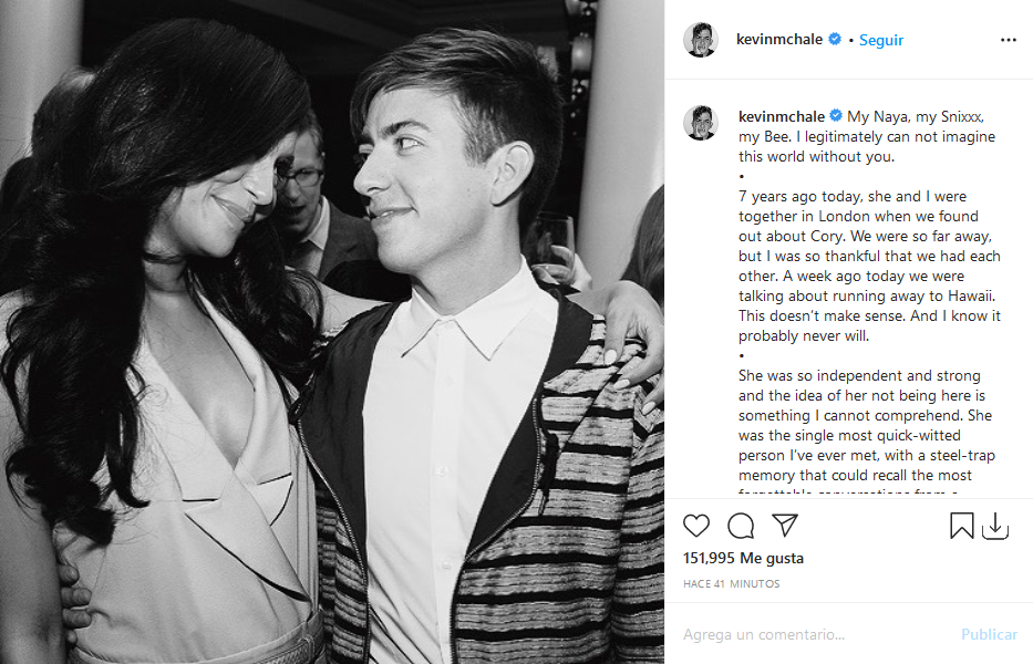 "Mi Naya, mi Snixxx, mi abeja. No puedo imaginar legítimamente este mundo sin ti. Hace 7 años hoy, ella y yo estábamos juntos en Londres cuando nos enteramos de Cory. Estábamos tan lejos, pero estaba tan agradecido de que nos teníamos el uno al otro. Hace una semana hoy estábamos hablando de huir a Hawai. Esto no tiene sentido. Y sé que probablemente nunca lo hará.