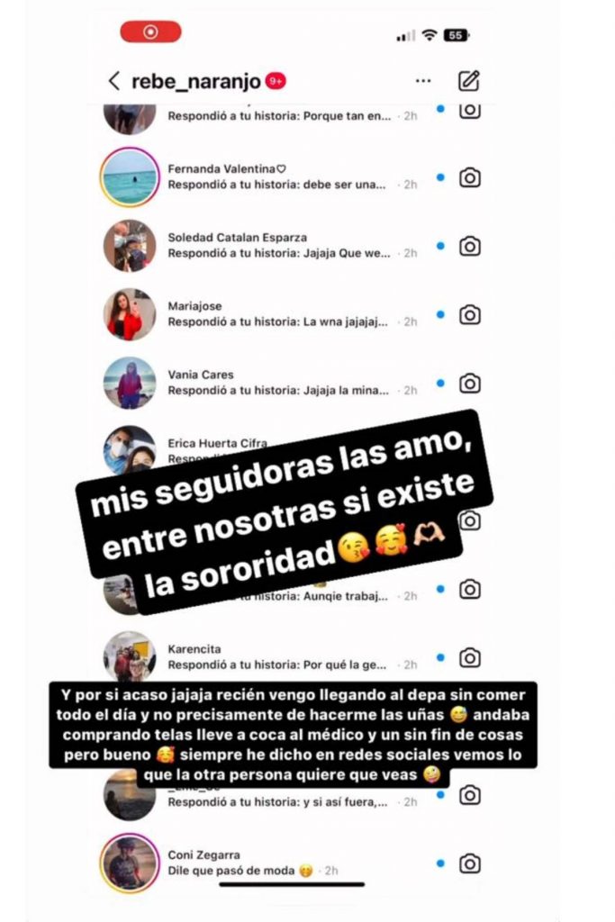 Ante este comentario mala onda, muchas de sus seguidoras le enviaron mensajes de apoyo. Con un video donde mostraba su pantalla, Rebe Naranjo compartió como se ve su bandeja de entrada agradeciendo las respuestas positivas. “Las amo, entre nosotras si existe sororidad", expresó.