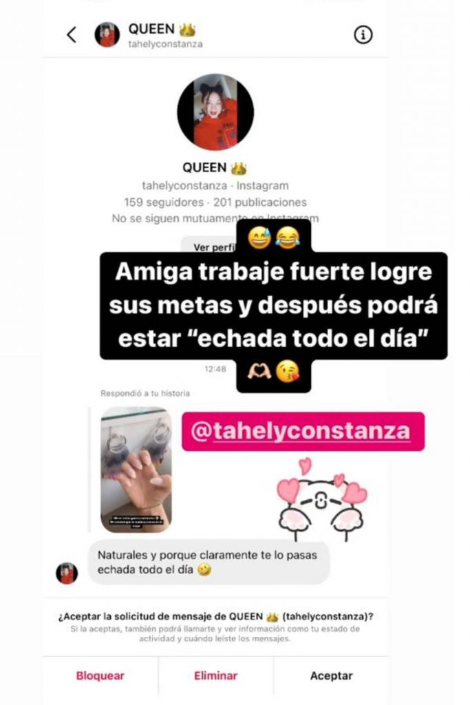 Fue el usuario de una mujer que se hace llamar Tahely Constanza la que decidió enviar un mensaje a la influencer a modo de burla. “Naturales y porque claramente te lo pasas echada todo el día”, escribió junto a un emoji riéndose.