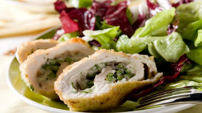Rellenas pechugas de pollo con espárragos previamente cocidos, lo sujetas bien y empiezas a freír el pollo, ojalá sean pedazos delgados para que se logre cocinar bien por dentro.