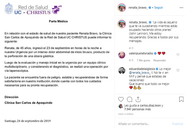 Por su parte, Renata acompañó el parte médico con un mensaje de agradecimiento junto a una cita de John Lennon.