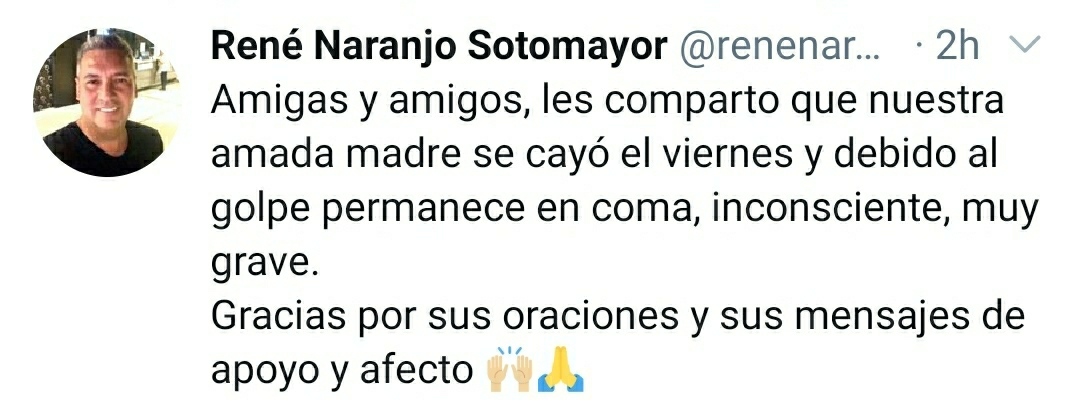 A través de su cuenta de Twitter, René Naranjo anunció el lamentable fallecimiento de su madre.