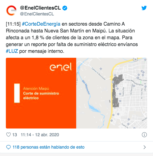 De acuerdo a los últimos reportes, la comuna de Maipú sería una de las más afectadas por un corte de luz en varios sectores como Ciudad Satélite, Camino a Rinconada y Nueva San Martín.