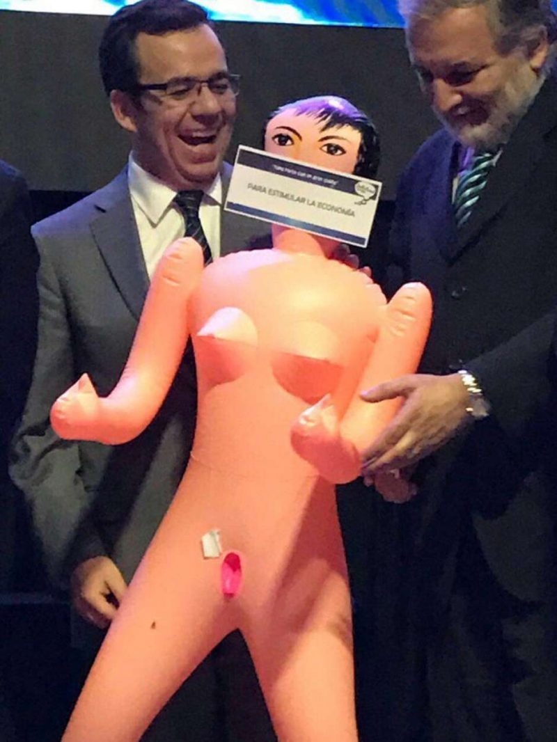"Para estimular la economía", Roberto Fantuzzi, presidente de la Asociación de Exportadores de Manufacturas (Asexma) no encontró nada mejor que regalarle una muñeca inflable al ministro de Economía, Luis Felipe Céspedes, durante la cena anual del gremio.