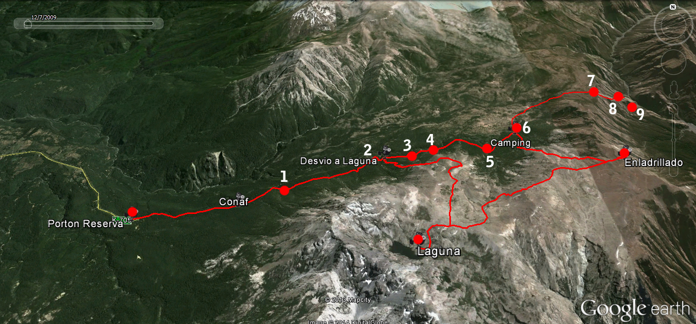 El sendero parte bajo el bosque nativo de: robles, coigües y ñirres y estepa altoandina. Alcanza la laguna, luego de una fuerte subida y similar bajada.