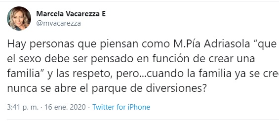 La psicóloga escribió en su cuenta de Twitter: "Hay personas que piensan como M. Pía Adriasola 'que el sexo debe ser pensado en función de crear una familia' y las respeto, pero… cuando la familia ya se creó, ¿nunca se abre el parque de diversiones?".