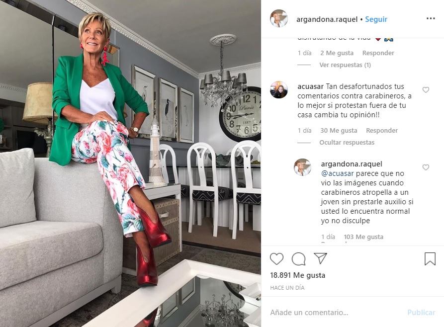 Las palabras de Argandoña incluso tuvieron repercusiones en su cuenta de Instagram, donde una usuaria le escribió: "tan desafortunados tus comentarios contra Carabineros. A lo mejor si protestan fuera de tu casa cambia tu opinión!!".
