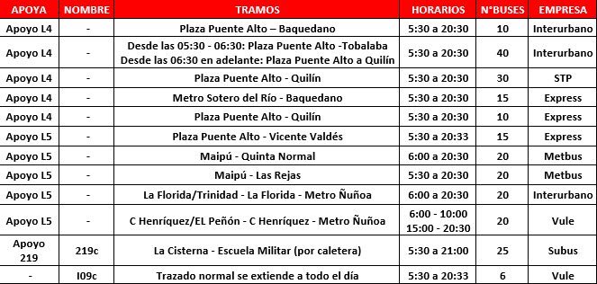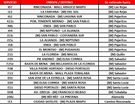 Serán en total 12 servicios que permitirán a los usuarios de las comunas de Puente Alto, La Florida, La Cisterna y Maipú, tener mayores alternativas para llegar a las estaciones de Metro que están operando o cerradas.