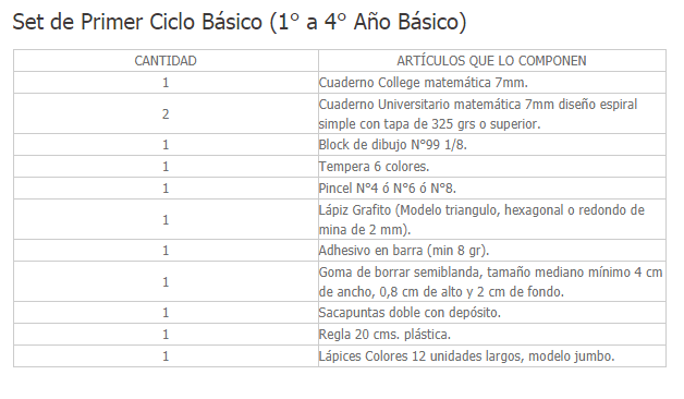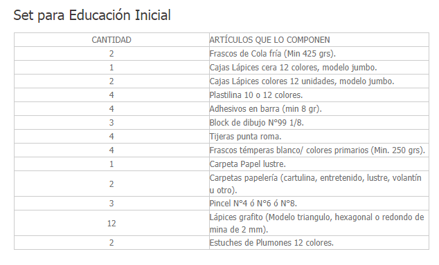 Revisa el detalle de los sets de útiles escolares: