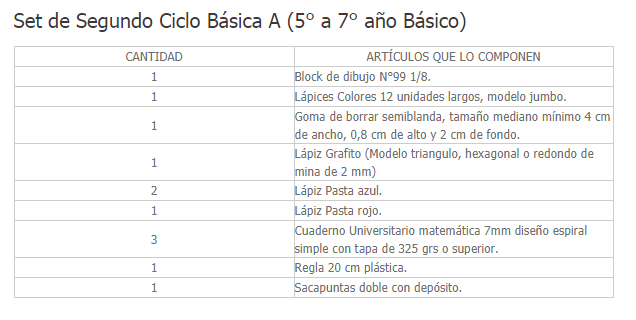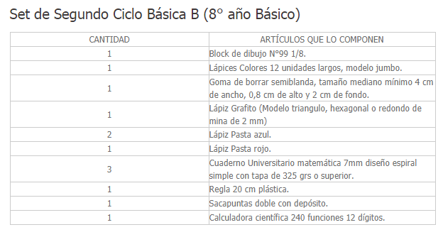 El set consiste en cuadernos, lápices, blocks de dibujo, témperas y también una calculadora científica para los alumnos que pasaron a octavo básico. Va dirigido a estudiantes de establecimientos públicos y que están adheridos a la gratuidad.