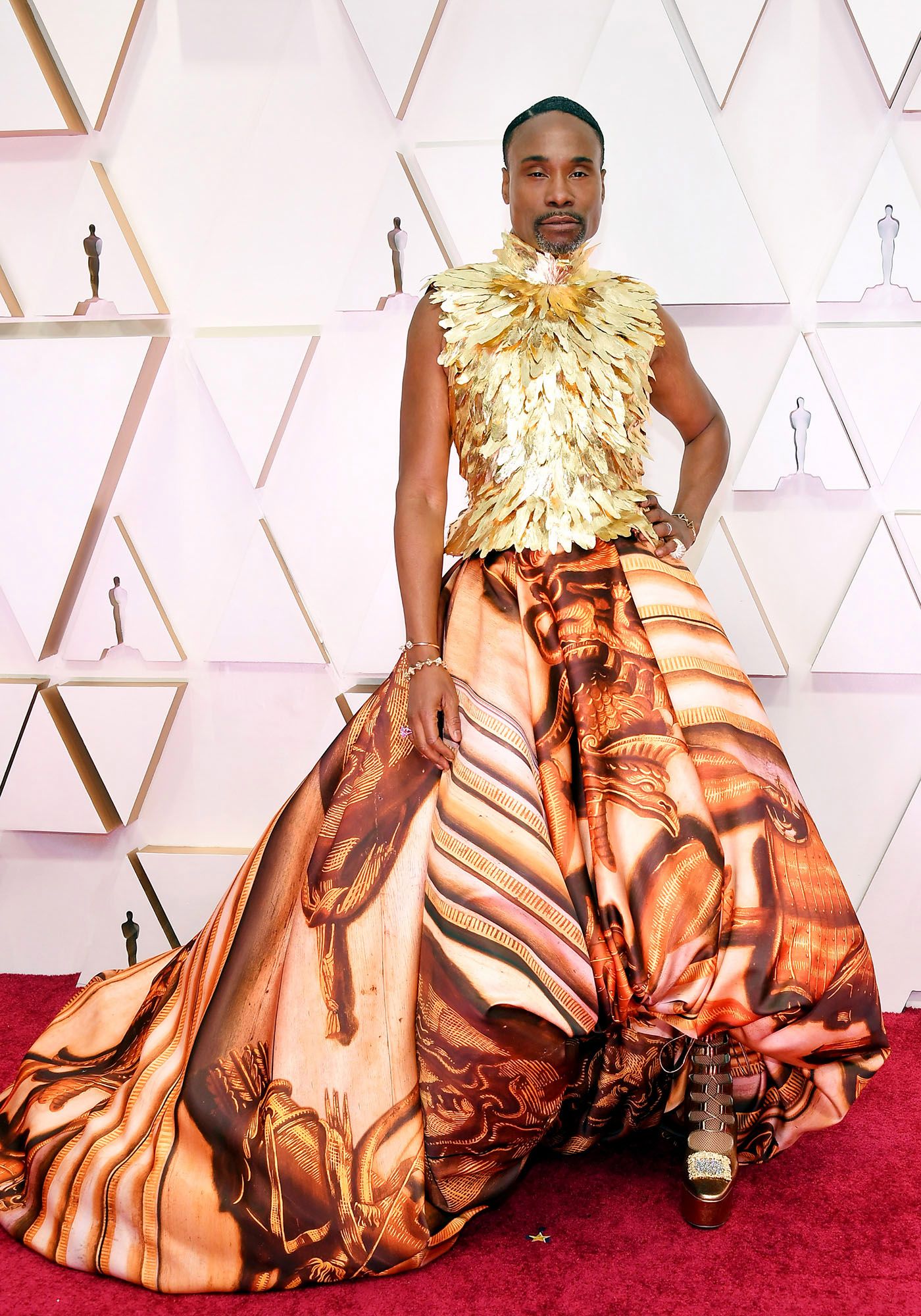 Finalmente, el actor Billy Porter fue el más atrevido de la alfombra roja, ya que escogió un outfit compuesto por falda, tacones y un cuerpo cubierto de plumas de oro de 24 kilates.