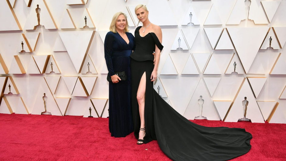 Charlize Theron llegó junto a su madre, Gerda Jacoba. Ambas escogieron colores oscuros para sus vestidos.