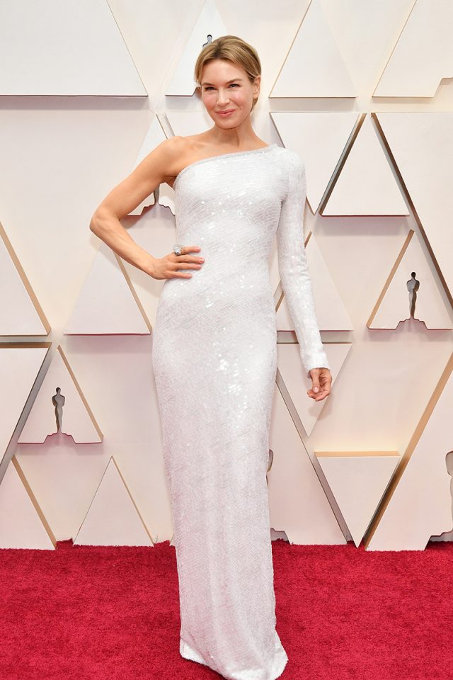 Renée Zellweger deslumbró con un diseño de escote asimétrico repleto de lentejuelas.