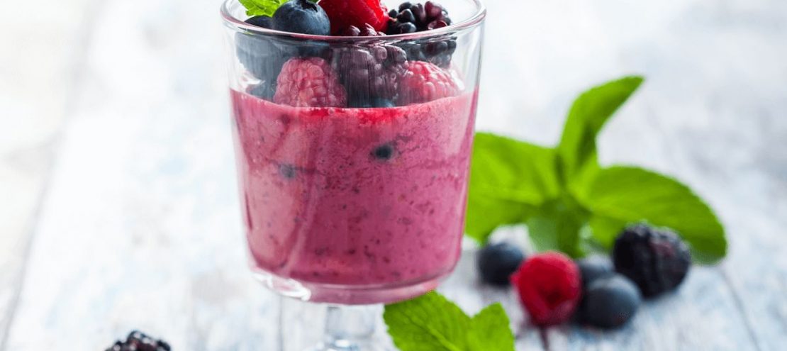 Enfriar la leche de coco en el refrigerador por algunos minutos. Luego, mezcla todos los ingredientes hasta obtener una crema fina. Si deseas sacar las semillas de los frutos rojos, puedes pasarlos por la licuadora aparte, y después colarlos.
