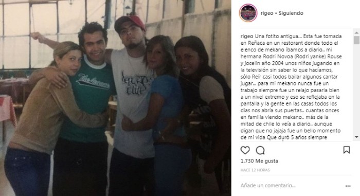 "Una fotito antigua, ésta fue tomada en Reñaca en un restorán donde todo el elenco de Mekano íbamos a diario. Mi hermana, Rodri Novoa (Rodri yanke) Rouse y Jocelyn año 2004, unos niños jugando en la televisión sin saber lo que hacíamos, sólo reír, casi todos bailar, algunos cantar, jugar”, partió escribiendo el cantante en su publicación.