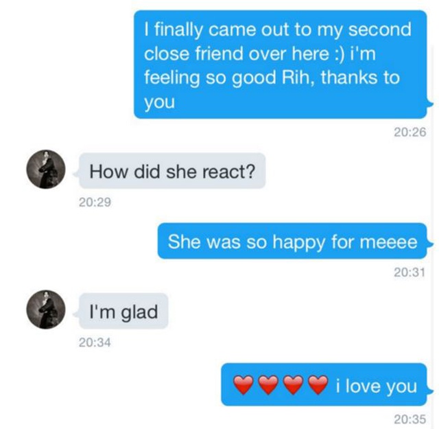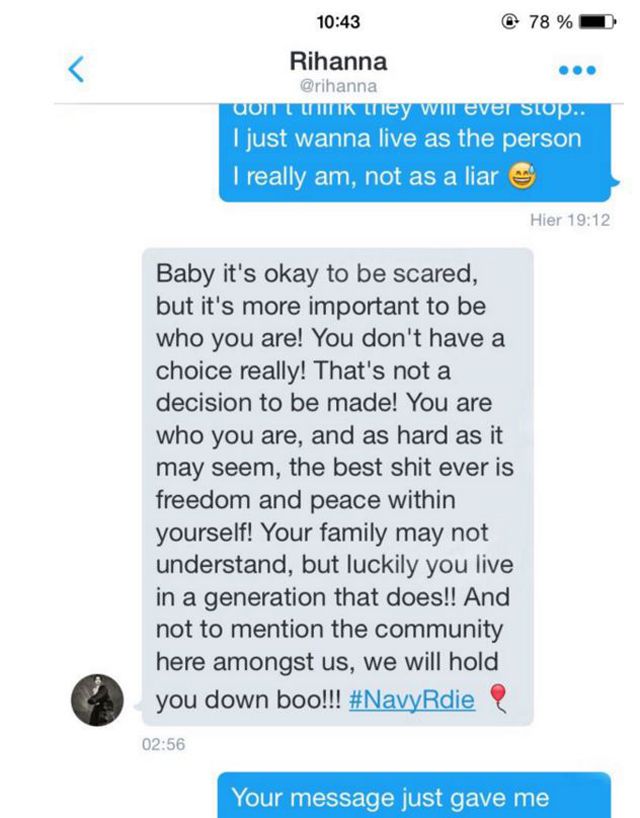 Luego de ese mensaje el joven decidió hablar de su condición sexual y le volvió a escribir a la cantante de Barbados: "Por fin he salido del armario con uno de mis amigos más cercanos. Gracias, Rih, me siento genial gracias a ti".