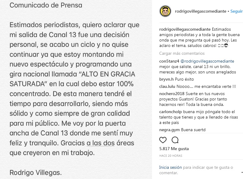 Y según aclaró Rodrigo Villegas, la decisión de su salida responde a sus próximos proyectos laborales. A través de un comunicado que publicó en sus redes sociales, el comediante afirmó que "Quiero aclarar que mi salida de Canal 13 fue una decisión personal, se acabo un ciclo y no quise continuar".