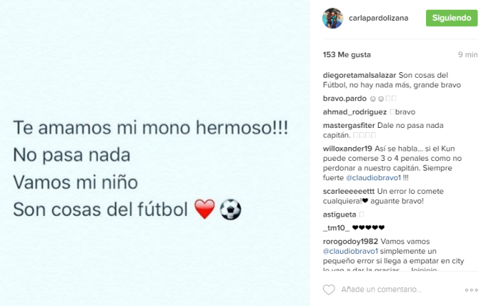 Ante la mala actuación que tuvo el arquero de la Selección chilena en el Manchester City -Leo Messi le hizo un gol y fue expulsado por el arbitro-, la bella Carla le dedicó un cariñoso mensaje de apoyo a través de Instagram.