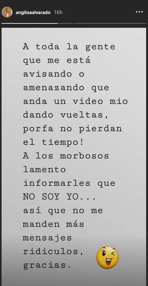 ¡A toda la gente que me está avisando o amenazando que anda un video mío dando vuelta, porfa no pierdan el tiempo! A los morbosos, lamento informarles que no soy yo...Así que no me manden más mensajes ridículos, gracias".