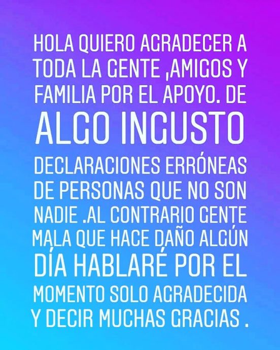 "Hola, quiero agradecer a toda la gente, amigos y familia por el apoyo de algo ingusto, declaraciones erróneas de personas que no son nadie, al contrario, gente mala que hace daño. Algún día hablaré, por el momento solo agradecida", escribió Rosemarie.
