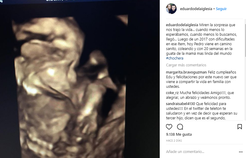 “Miren la sorpresa que nos trajo la vida… cuando menos lo esperábamos, cuando menos lo buscamos, llegó. Luego de un 2017 con dificultades en ese ítem, hoy Pedro viene en camino sanito, coleando y con 20 semanas en la guata de la mamá mas linda del mundo”, escribió.