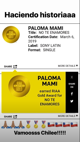 Esto se traduce en que la chilena sumó más de 30 mil unidades certificadas por la venta de la canción a través Amazon y iTunes, a lo que se agregan las reproducciones en plataformas de streaming como VEVO o Spotify.