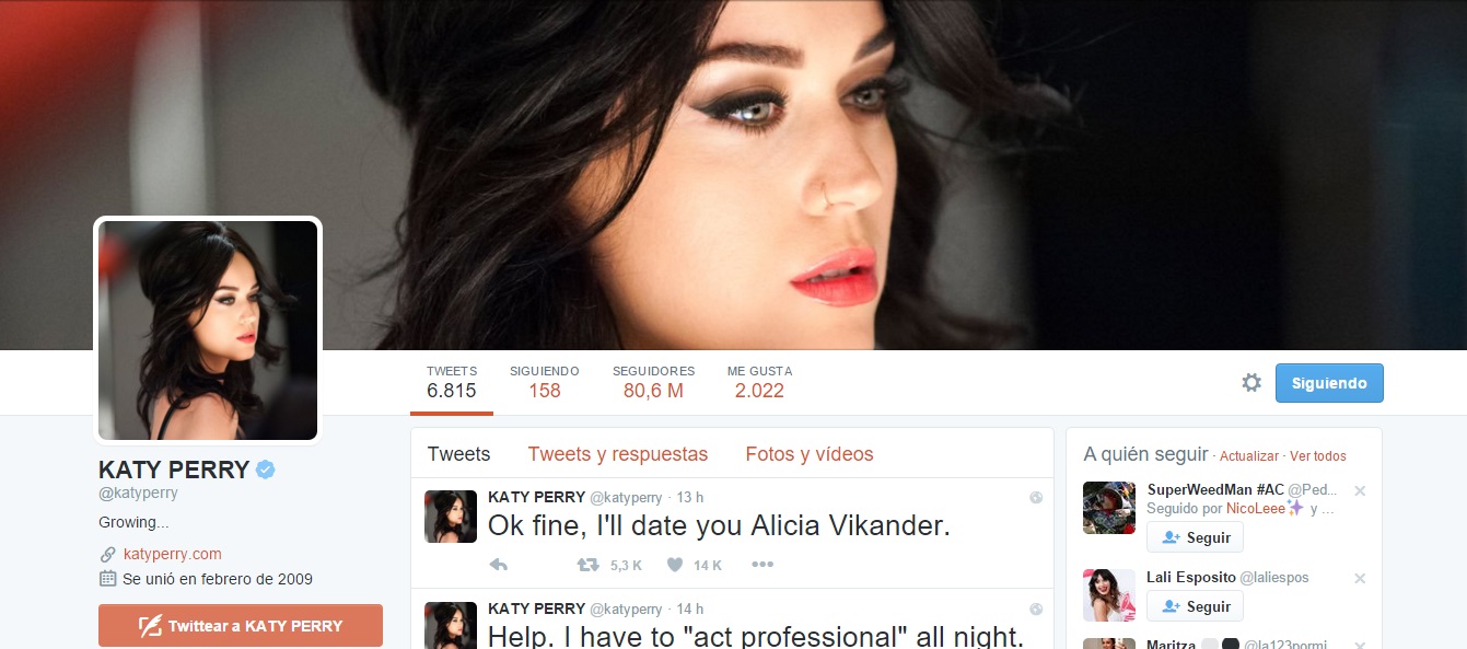 La cantante Katy Perry sigue siendo la reina indiscutida de la red social del pajarito, con más de 80 millones de seguidores.