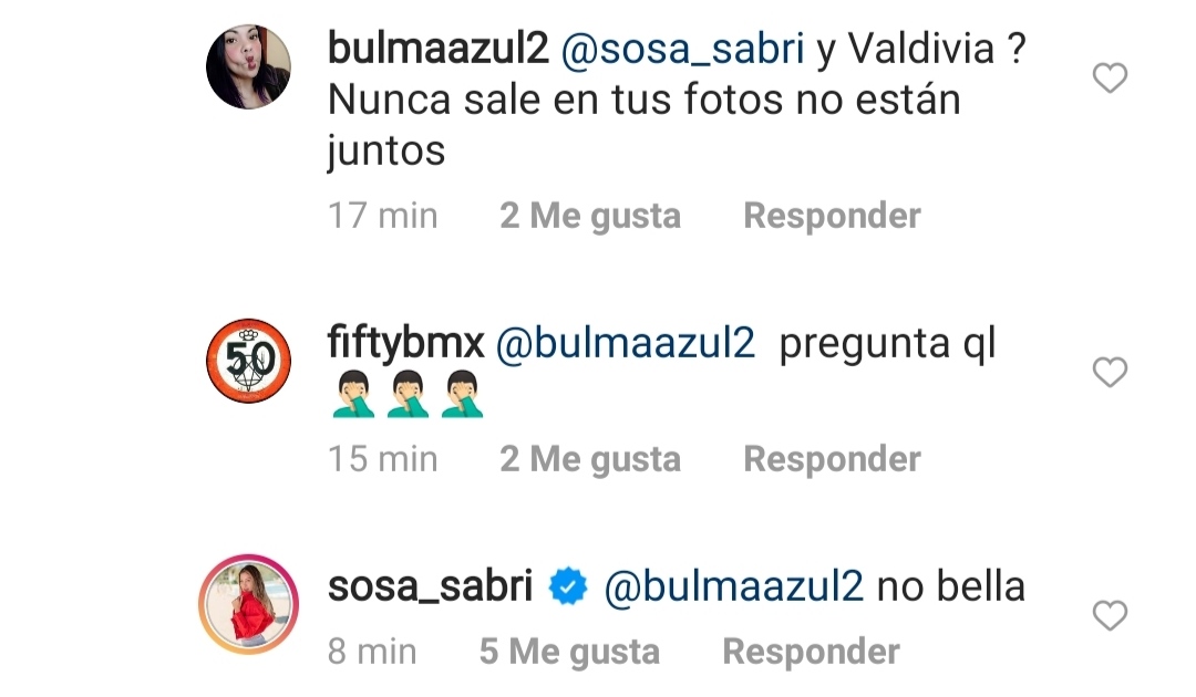 'Y Claudio Valdivia? Nunca sale en tus fotos. No están juntos?', le preguntó una usuaria de Instagram, a lo que Sabrina respondió 'no bella'.