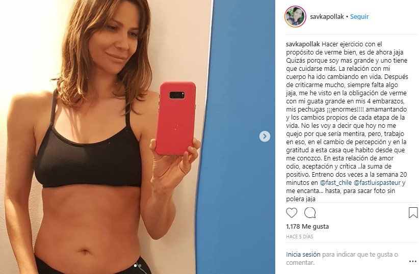 "No les voy a decir que hoy no me quejo por que sería mentira, pero trabajo en eso, en el cambio de percepción y en la gratitud a esta casa que habito desde que me conozco. En esta relación de amor odio, aceptación y crítica, la suma de positivo. Entreno dos veces a la semana 20 minutos en @fast_chile @fastluispasteur y me encanta (...) Bueno, media reflexión... Ando con ganas de celebrar la vida", agregó savka Pollak para acompañar esta imagen.