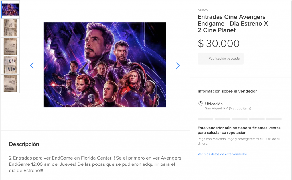 Pero esto no solo estaría pasando en nuestro país. Sino que en otro países los fanáticos de la saga intentaron, sin fortuna, conseguir entradas. En Estados Unidos, y por medio de Ebay, se puede ver usuarios vendiendo entradas para el final de la saga de Marvel Studios.