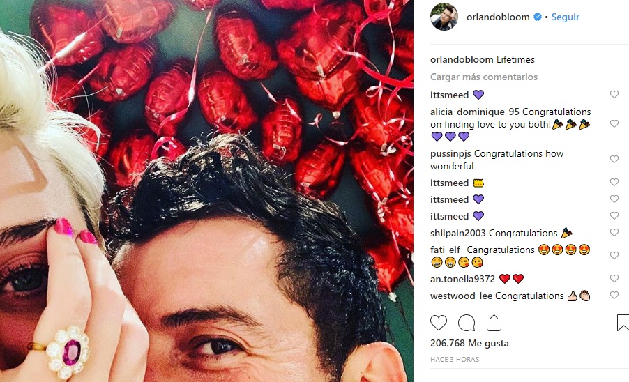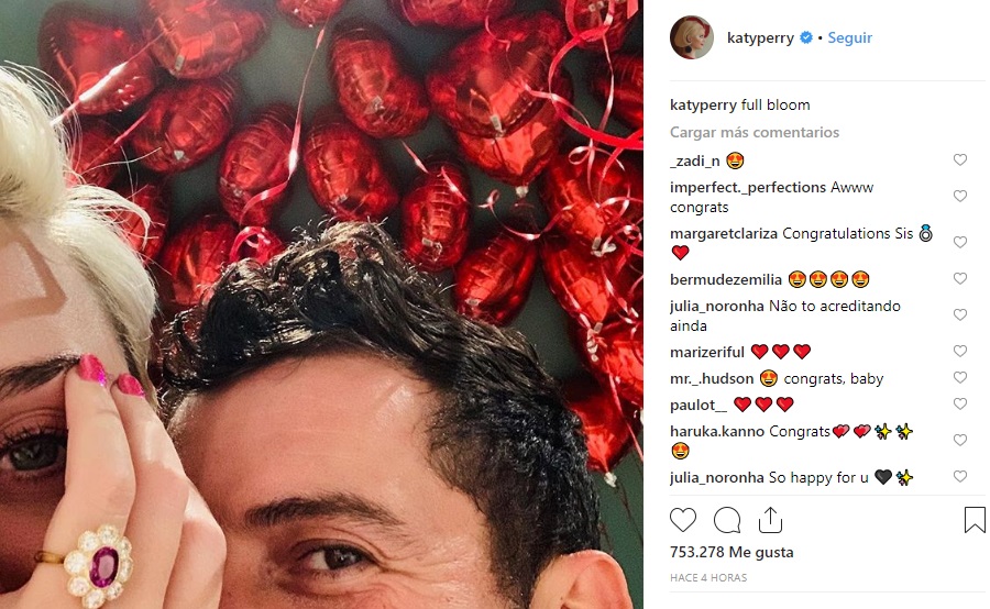 La publicación que compartió Katy Perry fue acompañada con el texto "En pleno florecimiento", un juego de palabras con la forma del anillo y el apellido del actor, Bloom, que significa "florecer".