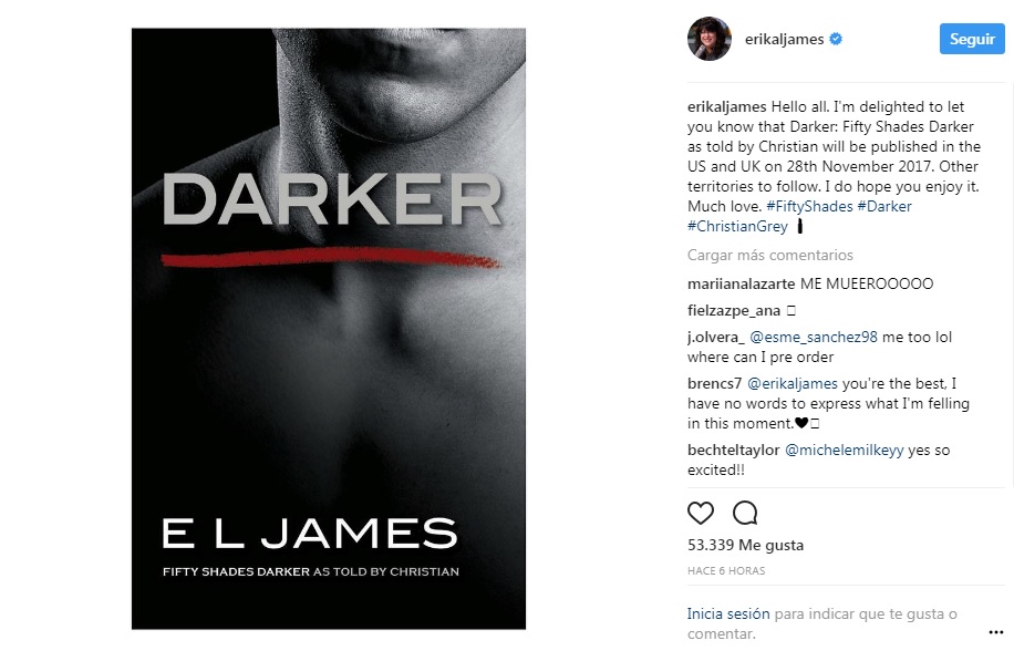 Porque según acaba de confirmar la misma la escritora de la saga E.L James en su cuenta de Instagram, la nueva novela, titulada "Darker: Fifty Shades Darker" será publicada oficialmente en Estados Unidos e Inglaterra: 28 de noviembre de 2017, por lo que podría llegar a Latinoamérica a principios del 2018.