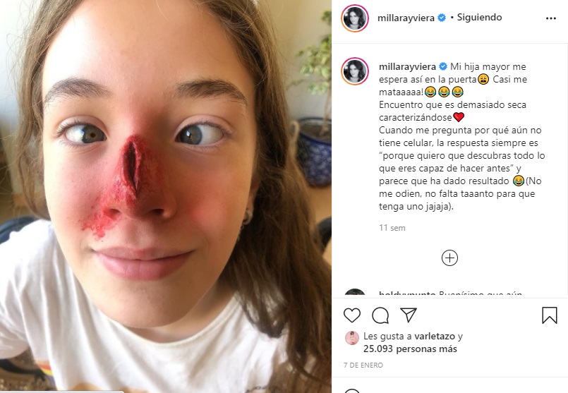 Y hace unas semanas, la propia conductora de "Yo soy" compartió una foto de una 'terrorífico' look que hizo su hija, para simular heridas. "Mi hija mayor me espera así en la puerta😩 Casi me mataaaaa!😂😂😂Encuentro que es demasiado seca caracterizándose❤️Cuando me pregunta por qué aún no tiene celular, la respuesta siempre es “porque quiero que descubras todo lo que eres capaz de hacer antes” y parece que ha dado resultado 😂(No me odien, no falta taaanto para que tenga uno jajaja)", escribió esa vez Millaray Viera.
