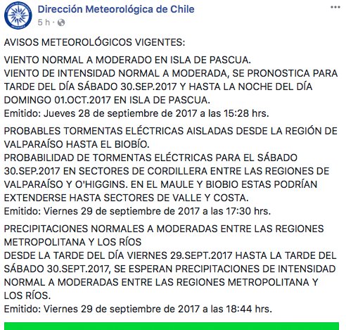 Asimismo, se anunció que las lluvias moderadas continuarán toda la tarde del sábado entre las regiones de Valparaíso a Los Ríos, las que podrían extenderse hasta las madrugada del domingo.