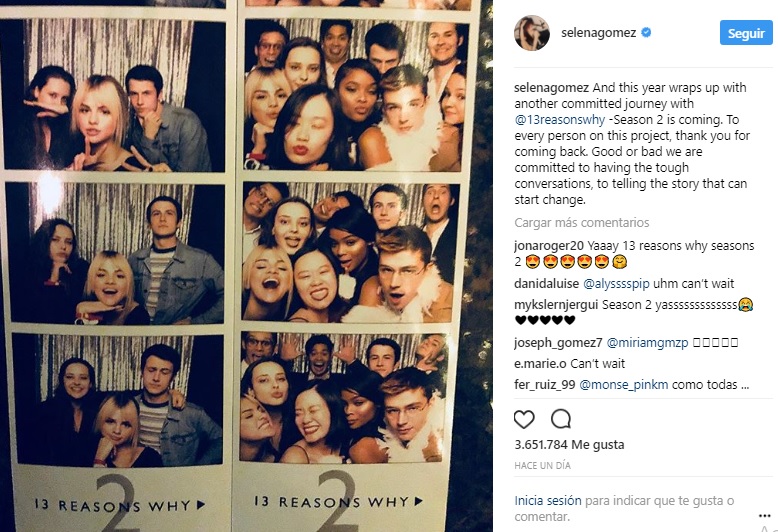 “Este año se cierra con otro viaje terminado con "Por trece razones". La temporada dos está llegando. A todas las personas en este proyecto: Gracias por volver”, escribió Selena para acompañar la imagen en la que aparece con gran parte del elenco, incluyendo a los protagonistas Dylan Minette y Katherine Langford.