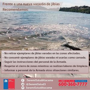 Por lo mismo, la Seremi de Salud de Atacama hizo un llamado a través de Twitter a "no retirar ni tocar los ejemplares que estén varados en la playa". También, aconsejó no consumir esta jibia bajo ninguna circunstancia y tampoco usarlas como carnada.